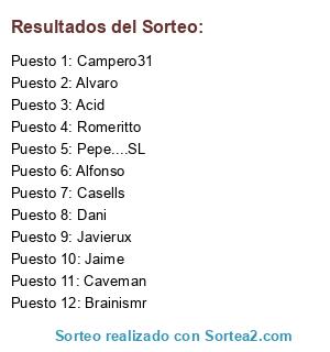 Lista de participantes: Acid, Campero31, Alvaro, Brainismr, Casells, Caveman, Pepe....SL, Alfonso, Romeritto, Dani, Jaime, Javierux.
