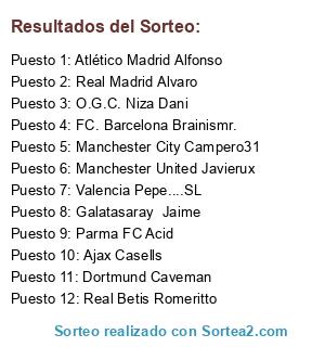 Lista de participantes: FC. Barcelona Brainismr., Valencia Pepe....SL, Manchester United Javierux, Manchester City Campero31, Parma FC Acid, Real Betis Romeritto, Real Madrid Alvaro, O.G.C. Niza Dani, Atlético Madrid Alfonso, Dortmund Caveman, Ajax Casells, Galatasaray Jaime.
