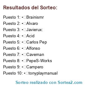 Lista de participantes: • Alfonso, • Alvaro, • Carlos Pep, • Acid, • Caveman, • tonyplaymanual, • Campero, • Brainismr, • Javierux:, • PepeS-Works.
