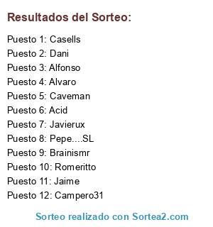 Lista de participantes: Acid, Campero31, Alvaro, Brainismr, Casells, Caveman, Pepe....SL, Alfonso, Romeritto, Dani, Jaime, Javierux.