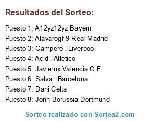 Lista de participantes: Jonh Borussia Dortmund, Dani Celta, Javierux Valencia C.F, Alavarogf-9 Real Madrid, A12yz12yz Bayern, Campero Liverpool, Salva Barcelona, Acid Atletico.