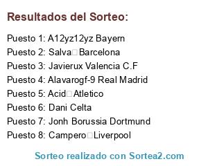 Lista de participantes: Jonh Borussia Dortmund, Dani Celta, Javierux Valencia C.F, Alavarogf-9 Real Madrid, A12yz12yz Bayern, Campero Liverpool, Salva Barcelona, Acid Atletico.