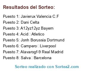 Lista de participantes: Jonh Borussia Dortmund, Dani Celta, Javierux Valencia C.F, Alavarogf-9 Real Madrid, A12yz12yz Bayern, Campero Liverpool, Salva Barcelona, Acid Atletico.