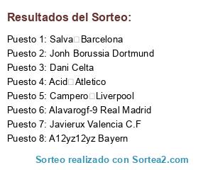 Lista de participantes: Jonh Borussia Dortmund, Dani Celta, Javierux Valencia C.F, Alavarogf-9 Real Madrid, A12yz12yz Bayern, Campero Liverpool, Salva Barcelona, Acid Atletico.