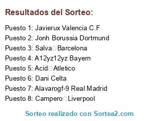 Lista de participantes: Jonh Borussia Dortmund, Dani Celta, Javierux Valencia C.F, Alavarogf-9 Real Madrid, A12yz12yz Bayern, Campero Liverpool, Salva Barcelona, Acid Atletico.