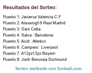 Lista de participantes: Jonh Borussia Dortmund, Dani Celta, Javierux Valencia C.F, Alavarogf-9 Real Madrid, A12yz12yz Bayern, Campero Liverpool, Salva Barcelona, Acid Atletico.