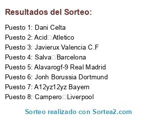 Lista de participantes: Jonh Borussia Dortmund, Dani Celta, Javierux Valencia C.F, Alavarogf-9 Real Madrid, A12yz12yz Bayern, Campero Liverpool, Salva Barcelona, Acid Atletico.