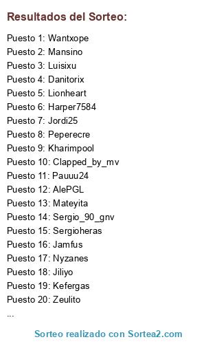 Lista de participantes: AlePGL, Xaviloko, Negri, Emilich, Lionheart, Wantxope, Cadista, Jiliyo, Fista, Daniorlo, Ronierm, Mansino, Jamfus, Sergio_90_gnv, Zeulito, Camandula, Messiano, Euskalplayer, Goar_cai, Jualzurita, Peperecre, Jesure, Luisixu, AlexRamos, Fresco, Malasombra, Kefergas, Soccatala, Jordi25, Ayo, Sergioheras, Lm1989gr, Caubo12, Mateyita, Kharimpool, Juanito_ercambio, PoloVCF, Danitorix, Kaiser-sh7, Pauuu24, Durbe, Migue86, Nyzanes, Monsterinho23, Franchu1234, Torneosgamingluis, Harper7584, Clapped_by_mv.