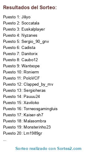 Lista de participantes: AlePGL, Xaviloko, Negri, Emilich, Lionheart, Wantxope, Cadista, Jiliyo, Fista, Daniorlo, Ronierm, Mansino, Jamfus, Sergio_90_gnv, Zeulito, Camandula, Messiano, Euskalplayer, Goar_cai, Jualzurita, Peperecre, Jesure, Luisixu, AlexRamos, Fresco, Malasombra, Kefergas, Soccatala, Jordi25, Ayo, Sergioheras, Lm1989gr, Caubo12, Mateyita, Kharimpool, Juanito_ercambio, PoloVCF, Danitorix, Kaiser-sh7, Pauuu24, Durbe, Migue86, Nyzanes, Monsterinho23, Franchu1234, Torneosgamingluis, Harper7584, Clapped_by_mv.
