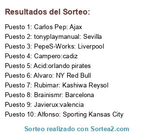 Lista de participantes: Brainismr: Barcelona, PepeS-Works: Liverpool, Alvaro: NY Red Bull, Campero:cadiz, Rubimar: Kashiwa Reysol, Alfonso: Sporting Kansas City, Carlos Pep: Ajax, Acid:orlando pirates, tonyplaymanual: Sevilla, Javierux:valencia.