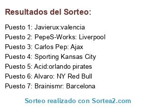 Lista de participantes: Acid:orlando pirates, Javierux:valencia, Carlos Pep: Ajax, PepeS-Works: Liverpool, Alvaro: NY Red Bull, Sporting Kansas City, Brainismr: Barcelona.