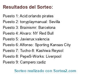 Lista de participantes: Campero:cadiz, Javierux:valencia, Acid:orlando pirates, Alvaro: NY Red Bull, Brainismr: Barcelona, tonyplaymanual: Sevilla, Alfonso: Sporting Kansas City, PepeS-Works: Liverpool, Tucho-8: Kashiwa Reysol.