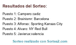 Lista de participantes: Campero:cadiz, Javierux:valencia, Alvaro: NY Red Bull, Brainismr: Barcelona, Alfonso: Sporting Kansas City.