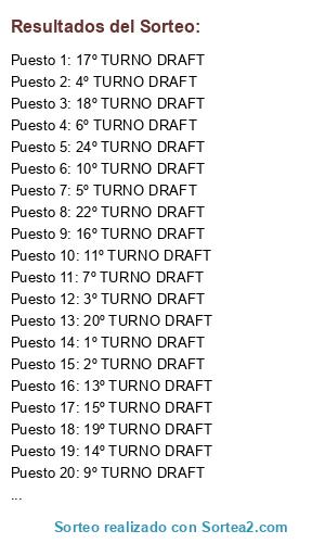 Lista de participantes: 1º TURNO DRAFT, 2º TURNO DRAFT, 3º TURNO DRAFT, 4º TURNO DRAFT, 5º TURNO DRAFT, 6º TURNO DRAFT, 7º TURNO DRAFT, 8º TURNO DRAFT, 9º TURNO DRAFT, 10º TURNO DRAFT, 11º TURNO DRAFT, 12º TURNO DRAFT, 13º TURNO DRAFT, 14º TURNO DRAFT, 15º TURNO DRAFT, 16º TURNO DRAFT, 17º TURNO DRAFT, 18º TURNO DRAFT, 19º TURNO DRAFT, 20º TURNO DRAFT, 21º TURNO DRAFT, 22º TURNO DRAFT, 23º TURNO DRAFT, 24º TURNO DRAFT.