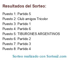 Lista de participantes: TIBURONES ARGENTINOS, Club amigos Tricolor, Partido 1, Partido 2, Partido 3, Partido 4, Partido 5, Partido 6.