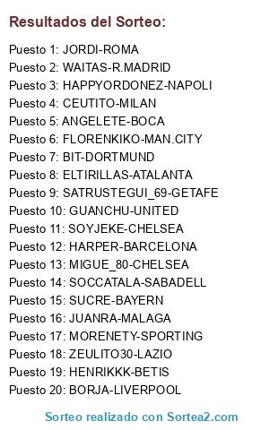 Lista de participantes: ELTIRILLAS-ATALANTA, CEUTITO-MILAN, SOCCATALA-SABADELL, HENRIKKK-BETIS, GUANCHU-UNITED, HARPER-BARCELONA, JORDI-ROMA, MORENETY-SPORTING, SATRUSTEGUI_69-GETAFE, MIGUE_80-CHELSEA, SUCRE-BAYERN, BIT-DORTMUND, ZEULITO30-LAZIO, HAPPYORDONEZ-NAPOLI, FLORENKIKO-MAN.CITY, BORJA-LIVERPOOL, JUANRA-MALAGA, ANGELETE-BOCA, WAITAS-R.MADRID, SOYJEKE-CHELSEA.