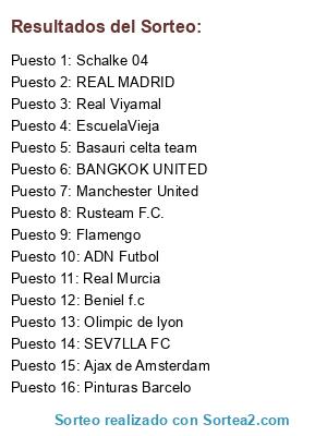 Lista de participantes: Real Murcia, Olimpic de lyon, Flamengo, Beniel f.c, Pinturas Barcelo, Ajax de Amsterdam, REAL MADRID, Manchester United, Rusteam F.C., SEV7LLA FC, Schalke 04, ADN Futbol, Real Viyamal, Basauri celta team, BANGKOK UNITED, EscuelaVieja.