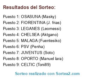 Lista de participantes: BAYERN LEVERKUSEN (Baricelli), PSV (Penha), CELTIC (Toni89), MONACO (Luiso), OPORTO (Manuel lara), CELTA (Reidaria), JUVENTUS (Soto), CHELSEA (Aktgano), MALAGA (Fuentesiko), LEGANES (Leomessi), FIORENTINA (J. frias), OSASUNA (Masky).