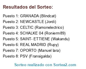 Lista de participantes: GRANADA (Fabiano), CADIZ (Falin), REAL MADRID (Rupy), LEICESTER (Troyano), WEST HAM (Kamikaze), MANCHESTER UNITED (Pescaito), CORDOBA (Juanmi), SCHALKE 04 (Ronierm89), UNION ESPAÑOLA (Leopardo), BORUSSIA DORTMUND (Adriniebla), TENERIFE (Alu), PSG (Parrika), LAZIO (Luisminho), ROMA (Jiliyo).