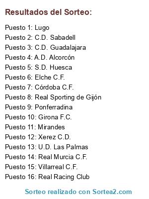 Lista de participantes: Villarreal C.F., Real Racing Club, Elche C.F., C.D. Sabadell, Córdoba C.F., U.D. Las Palmas, A.D. Alcorcón, C.D. Guadalajara, S.D. Huesca, Xerez C.D., Girona F.C., Real Sporting de Gijón, Real Murcia C.F., Ponferradina, Lugo, Mirandes.