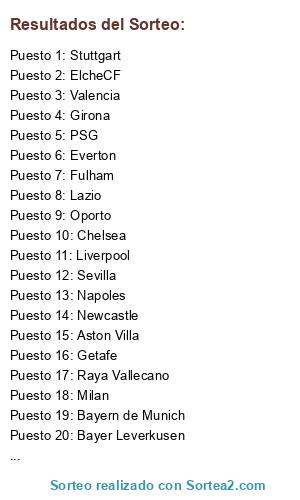 Lista de participantes: Roma, Valencia, Fulham, Oporto, PSG, Getafe, Bayern de Munich, Bayer Leverkusen, Borussia Dortmund, Chelsea, Everton, Aston Villa, Barcelona, Girona, Kaiserslautern, Lazio, Celta, Inter, ElcheCF, Liverpool, Leeds United, Manchester United, Newcastle, Levante, Sevilla, Stuttgart, Sevillo Atlétco, Raya Vallecano, Monaco, Napoles, Norwich, Milan.