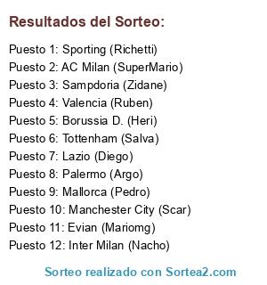 Lista de participantes: Valencia (Ruben), AC Milan (SuperMario), Evian (Mariomg), Mallorca (Pedro), Sampdoria (Zidane), Sporting (Richetti), Palermo (Argo), Inter Milan (Nacho), Borussia D. (Heri), Lazio (Diego), Tottenham (Salva), Manchester City (Scar).