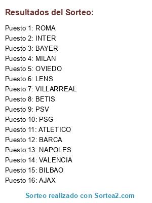 Lista de participantes: PSV, VILLARREAL, LENS, AJAX, PSG, NAPOLES, BILBAO, OVIEDO, ATLETICO, ROMA, MILAN, BAYER, INTER, BARCA, BETIS, VALENCIA.