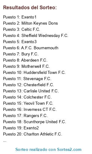 Lista de participantes: A.F.C. Bournemouth, Brentford F.C., Bury F.C., Carlisle United F.C., Charlton Athletic F.C., Chesterfield F.C., Colchester F.C., Exeter City F.C., Hartlepool F.C., Huddersfield Town F.C., Leyton Orient F.C., Milton Keynes Dons, Notts County F.C., Oldham Athletic A.F.C., Preston North End F.C., Rochdale A.F.C., Scunthorpe United F.C., Sheffield United F.C., Sheffield Wednesday F.C., Stevenage F.C., Tranmere Rovers F.C., Walsall F.C., Wycombre F.C., Yeovil Town F.C., Aberdeen F.C., Celtic F.C., Dundee United F.C., Dunfermline Athletic F.C., Hearts of Midlothian F.C., Hibernian F.C., Inverness CT F.C., Kilmarnock F.C., Motherwell F.C., Rangers F.C., St Johnstone F.C., St Mirren F.C., Exento1, Exento2, Exento3, Exento4.