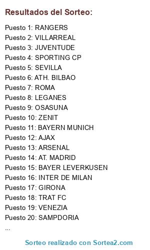 Lista de participantes: FLAMENGO, DORTMUND, BARCELONA, CASTELLON, SAMPDORIA, TENERIFE, VALENCIA, INTER DE MILAN, ARSENAL, TOTTENHAM, BAYERN MUNICH, VILLARREAL, RANGERS, CHAPECOENSE, VENEZIA, CADIZ, GIRONA, JUVENTUDE, OPORTO, UNION ESPAÑOLA, TRAT FC, BAYER LEVERKUSEN, NAPOLES, ZENIT, OSASUNA, AT. MADRID, SEVILLA, REAL MADRID, OOSTENDE, WEST HAM, LIVERPOOL, REAL BETIS, CHELSEA, SPORTING CP, PARMA, ASTON VILLA, RIVER PLATE, PSG, ATH. BILBAO, MAN. UNITED, LUGO, JUVENTUS, ONCE CALDAS, ROMA, WOLVES, AJAX, ATALANTA, LEGANES.