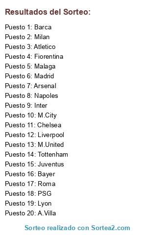 Lista de participantes: Liverpool, Atletico, Barca, Juventus, Arsenal, Milan, Malaga, PSG, M.United, Madrid, A.Villa, Roma, Bayer, Fiorentina, Chelsea, M.City, Inter, Napoles, Tottenham, Lyon.