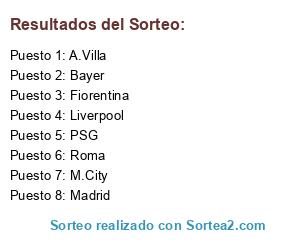 Lista de participantes: Barcelona, Bayer, Chelsea, Milan, Tottenham, Inter, M.United, Madrid, M.City, Juventus, Atletico, Malaga, Arsenal, A.Villa, Liverpool, PSG, Lyon, Napoi, Fiorentina, Roma.