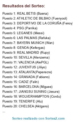 Lista de participantes: BARCELONA (Miguee), INTER DE MILAN (Luisixu), NEWCASTLE (Jordi), MANCHESTER CITY (Vidalsergi), MILAN (Fista), GAZISEHIR GAZIANTEP (Kamikaze), VILLAREAL (Negri), PSG (Parrika), BAYERN LEVERKUSEN (Baricelli), PSV (Fransigalda), SCHALKE 04 (Ronierm89), REAL MADRID (Rupy), MOREIRENSE(Lincedeo), CELTIC (Toni89), CHELSEA (Aktgano), ATALANTA(Peperecre), TENERIFE (Alu), MANCHESTER UNITED (Pescaito), DEPORTIVO DE LA CORUÑA (Fenoy), OPORTO (Manuel lara), CORDOBA (Juanmi), BAYERN MUNICH (Wan), LIVERPOOL (Estupeyonk), REDBULL LEIPZIG (Toni3_13), LAZIO (Diegomat), SEVILLA (Alenzema), JUVENTUS (Jiliyo), LEICESTER (Troyano), SAMPDORIA (Ramonelectrico), BESIKTAS (Sergiocule), GENOA (Kefergas), CADIZ (Falin), VALENCIA (AlePGL), LEVANTE (Poliny), BOCA JUNIORS (Joker), LAS PALMAS (Rafuka), REAL BETIS (Baena), ATHLETIC DE BILBAO (Fuenyool), ATLETICO DE MADRID (Daniorlo), SAINT- ETTIENE (Wakandu), ROMA (Globetrotter), JIANGSU SUNING (Jesure), GRANADA (Fabiano), BASEL (Leopardo), WOLVERHAMPTON (Cordu), MARBELLA (Fuentesiko), LEGANES (Messi), UNION ESPAÑOLA (Alexsoler).