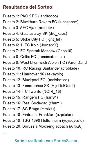 Lista de participantes: PAOK FC (jandroooo), Bolton Wanderers FC (tula15), FC Lokomotiv Moscow (kexulo), RCD Mallorca (_alex_), Blackburn Rovers FC (alccapone), CA Osasuna (youssef1981), AS Saint-Etienne (juampi), UC Sampdoria (javi_230580), TSG 1899 Hoffenheim (yoysoycule), VfB Stuttgart (eL_oKi), Celtic FC (Leminsdemins), FC Twente (NOIR_46), SC Braga (elmixtu), PSV Eindohven (yorugua25), Hercules CF (ismaeljimva), AFC Ajax (roderick), Trabzonspor KR (label74), Real Zaragoza SAD (leandro444), Panathinaikos FC (Nerus96), Blackpool FC (moixbetico), 1. FC Köln (JorgebrX), Real Sociedad (chumi), Besiktas JK (_Lord_), Borussia Möchengladbach (Alfp26), Birmingham City FC (Julio), Stoke City FC (light_hd), RC Racing Santander (problade), FC Rubin Kazan (superuce), AJ Auxerre (Jackiekiki), Newcastle United FC (serjy), West Bromwich Albion FC (VaronDandi), Rangers FC (fran94), Sunderland AFC (pitudj), FC Dynamo Moscow (super-esteban), Olympiakos FC (daviolico9), FC Spartak Moscow (Cebo10), Genoa CFC (carlinhos_8), FC Parma (Elcorso), Eintracht Frankfurt (azpitako), USC Palermo (pperlop), Hannover 96 (eskayolo), Udinese Calcio (Sano31), West Ham United (Kornich), RC Deportivo Coruña (borjaoli), Fenerbahce SK (HijoDelGordi), RCD Espanyol (danieliyo), Getafe CF (chavahacker), Galatasaray SK (drd_kaos).