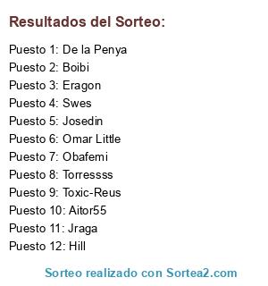 Lista de participantes: Aitor55, Boibi, De la Penya, Eragon, Josedin, Jraga, Obafemi, Omar Little, Swes, Torressss, Toxic-Reus, Hill.