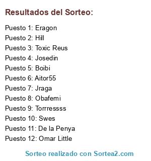 Lista de participantes: Hill, Omar Little, Swes, Torrressss, Aitor55, Boibi, De la Penya, Eragon, Josedin, Jraga, Obafemi, Toxic Reus.