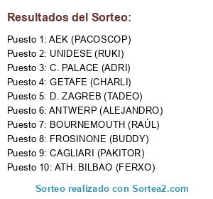 Lista de participantes: ATH. BILBAO (FERXO), D. ZAGREB (TADEO), AEK (PACOSCOP), UNIDESE (RUKI), GETAFE (CHARLI), ANTWERP (ALEJANDRO), C. PALACE (ADRI), CAGLIARI (PAKITOR), FROSINONE (BUDDY), BOURNEMOUTH (RAÚL).