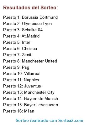 Lista de participantes: Inter, Bayern de Munich, Villarreal, Juventus, Schalke 04, Zenit, Borussia Dortmund, Napoles, Manchester United, Milan, Chelsea, Olympique Lyon, At.Madrid, Manchester City, Bayer Leverkusen, Psg.