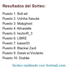 Lista de participantes: Bull-ed, Derek el Virulento, Uchiha Sasuke, Athanielle, kaiser03, Blackwi Zard, Malyghost, Doddie, hectorR_3, LIBRE.