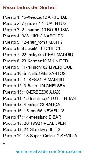 Lista de participantes: 1- SESAN A.MADRID, 2- joarme_10 BORRUSIA, 3-Beko_10i CHELSEA, 4-halop123 BARÇA, 5- Gulllivilly REAL SOCIEDAD, 6-Zalillo1985 SANTOS, 7-gauxo_17 JUVENTUS, 8-JesuML ELCHE CF, 9-WILIKI18 NAPOLES, 10-ERBEZ08 AJAX, 11-Nilsson182 LIVERPOOL, 12-shur_roma M.CITY, 13-IrishBhoy7 TOTTENHAN, 14-messiano EIBAR, 15- xou86 NEWELL´S, 16-XeeXuu12 ARSENAL, 17- dikens BAYERN, 18-Super_Ciclon_2 SEVILLA, 19- MarcosGC1988 INTER DE MILAN, 20- ISS21 REAL JAEN, 21-Standbyx BETIS, 22- mikykko REAL MADRID, 23-Kerman10 M.UNITED, 24-acerdv3 PSV.