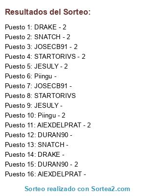 Lista de participantes: STARTORIVS, JOSECB91 -, JESULY -, DURAN90 -, AlEXDELPRAT -, SNATCH -, DRAKE -, Piingu -, STARTORIVS - 2, JOSECB91 - 2, JESULY - 2, DURAN90 - 2, AlEXDELPRAT - 2, SNATCH - 2, DRAKE - 2, Piingu - 2.