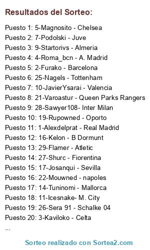 Lista de participantes: 1-Alexdelprat - Real Madrid, 2-Furako - Barcelona, 3-Kaviloko - Celta, 4-Roma_bcn - A. Madrid, 5-Magnosito - Chelsea, 6-Fugtive - manchester united, 7-Podolski - Juve, 8-Enpho69 - Arsenal, 9-Startorivs - Almeria, 10-JavierYsarai - Valencia, 11-Icesnake- M. City, 12-Malossi85 - PSG, 13-Atalaga- Betis, 14-Tuninomi - Mallorca, 15-Aivavi - Bayern Munich, 16-Kelon - B Dormunt, 17-Josanqui - Sevilla, 18-Ziborgraiden - Zenit, 19-Rupowned - Oporto, 20-Russ86 - Roma, 21-Varoastur - Queen Parks Rangers, 22-Mouwned - napoles, 23-Snatch - Liverpool, 24-Karin Benzema - Milan, 25-Nagels - Tottenham, 26-Sera 91 - Schalke 04, 27-Shurc - Fiorentina, 28-Sawyer108- Inter Milan, 29-Flamer - Atletic, 30-Dj_maik - santos.