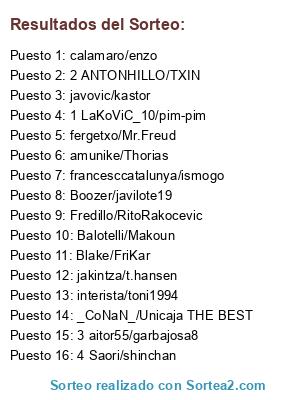 Lista de participantes: 1 LaKoViC_10/pim-pim, 2 ANTONHILLO/TXIN , 3 aitor55/garbajosa8 , 4 Saori/shinchan, francesccatalunya/ismogo, javovic/kastor , jakintza/t.hansen , fergetxo/Mr.Freud, Balotelli/Makoun, _CoNaN_/Unicaja THE BEST, calamaro/enzo, Blake/FriKar, Boozer/javilote19, amunike/Thorias, Fredillo/RitoRakocevic, interista/toni1994.