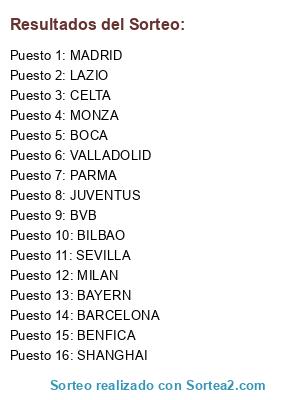 Lista de participantes: JUVENTUS, BVB, VALLADOLID, PARMA, MILAN, MONZA, BENFICA, SHANGHAI, SEVILLA, LAZIO, CELTA, MADRID, BILBAO, BOCA, BAYERN, BARCELONA.