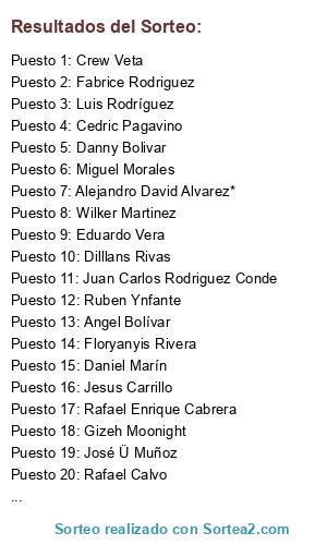 Lista de participantes: Miguel Morales, Kristhian Vargas, Rafael Enrique Cabrera, Miguel Hernandez, Victor Eladio Rojas, Wilker Martinez, Manuel Hernandez, Sira Lopez, Chicerio Indriago, Vulcam Flowey Charly Garcia, Andrés Bencomo, Eduardo Vera, Joshua Alexander, Wilkeber Javier Martinez Sosa, Rafael Calvo, Hector Alburjas, Cedric Pagavino, Luis Miguel Martinez Montes, David Arenas, Christian David de Sousa, Victor Kneider, Javier Eduardo Tritton Barreto, Gizeh Moonight, Jouberth Sulbaran, Daniel Marín, Anderson Lel, Daniel Hernandez, Javier Mariño, Junior Durant, Luis Rodríguez, Franliz Zambrano, Crew Veta, Alfonso Coelho, Floryanyis Rivera, Josseth Anthony Villanueva, Dilllans Rivas, Ruben Ynfante, Fabrice Rodriguez, Carlos Navarro, Carlos Daniel Sambrano, Hendrick Gutierrez, Yoan F Ramirez, José Ynaga, José Miguel Limonggi Sánchez, Alejandro David Alvarez*, Jesús Alberto Rondón, Daniel Revilla, Jesus Alfonzo, Jesus Sifontes, Isaac Villate*, Erison Castro, José Ü Muñoz, Jesus Eduardo Viur, Luis Perez, Juan Carlos Rodriguez Conde, Pedro Sánchez, Juan José Pumero, Rafael José Morales Carrero, IzokuSage, Angel José Castellano Romero, Yamil José Luces Sánchez, Angel Bolívar, Luis Pulido, José Ponticelli, Luis Alonso Calatrava Mejias, Luis Araujo, Marcos Alfonso, Ander Mendez, Daniel Alexander, Freddy Herrera, Manfrick Rivas, Lyex Ls, José Lugo Hernandez, Josué Bonett, Alejandro Sanchez, Paola Kortigbah, Leonardo José Rivero Motta, Carlos Danii, Julio Alberto Espinoza, Sam Ramirez Navas, Juan Casanova, Enderson Alejandro Bordones, Jesus Carrillo, Jesus Garzón (2 participaciones), Danny Bolivar, Nato Vadsang, Armando Salazar, Manuel Matos Vasquez, Lee Rock.