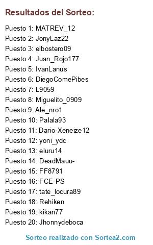 Lista de participantes: FF8791, Dario-Xeneize12, IvanLanus, yoni_ydc, Jhonnydeboca, FCE-PS, Ale_nro1, MATREV_12, Miguelito_0909, Palala93, Juan_Rojo177, DeadMauu-, tate_locura89, eluru14, DiegoComePibes, L9059, elbostero09, JonyLaz22, kikan77, Rehiken.