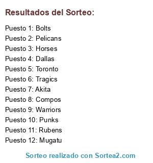 Lista de participantes: Pelicans (60), Akita (40), Compos (150), Mugatu (30), Tragics (70), Warriors (100), Bolts (80), Dallas (250), Horses (90), Punks (200), Rubens (10), Toronto (50).