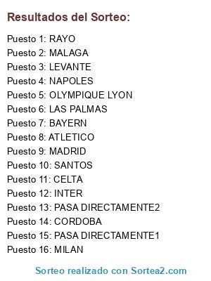Lista de participantes: RAYO, MALAGA, ATLETICO, NAPOLES, LAS PALMAS, BAYERN, INTER, LEVANTE, MILAN, MADRID, OLYMPIQUE LYON, CORDOBA, SANTOS, CELTA, PASA DIRECTAMENTE1, PASA DIRECTAMENTE2.