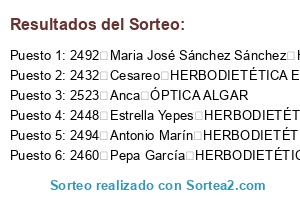 Lista de participantes: 2524 Alba Guirao ÓPTICA ALGAR , 2523 Anca ÓPTICA ALGAR , 2522 Flori Sánchez González ÓPTICA ALGAR , 2521 Anca ÓPTICA ALGAR , 2520 Manuel Gómez Expósito ÓPTICA ALGAR , 2519 Sergio Colmeiro Vega ÓPTICA ALGAR , 2518 Manuel Gómez Expósito ÓPTICA ALGAR , 2517 Ana Maria Marin HERBODIETÉTICA EL ALGAR , 2516 HUGO FUNES HERBODIETÉTICA EL ALGAR , 2515 Miguel Pérez Castejón ÓPTICA ALGAR , 2514 Juana Sánchez Olmos ÓPTICA ALGAR , 2513 Miguel Pérez Castejón ÓPTICA ALGAR , 2512 Maria José Raffaeli HERBODIETÉTICA EL ALGAR , 2511 Toñi bañes saura PIRÁMIDE SHOP , 2510 Ana Heredia PIRÁMIDE SHOP , 2509 Maria José Raffaeli HERBODIETÉTICA EL ALGAR , 2508 Juana Sánchez Olmos ÓPTICA ALGAR , 2507 Concepción Martínez Blaya ÓPTICA ALGAR , 2506 Cesáreo Tristante Martinez MI MOVIL ONLINE , 2505 Estela Albaladejo NARIMA NEW , 2504 Ana Torres Navarro NARIMA NEW , 2503 Jose Angel HERBODIETÉTICA EL ALGAR , 2502 Antonio Garcia Legaz HERBODIETÉTICA EL ALGAR , 2501 Pedro HERBODIETÉTICA EL ALGAR , 2500 JOSY SOTO HERBODIETÉTICA EL ALGAR , 2499 JOSY SOTO HERBODIETÉTICA EL ALGAR , 2498 JOSY SOTO HERBODIETÉTICA EL ALGAR , 2497 JOSY SOTO HERBODIETÉTICA EL ALGAR , 2496 Pedro Martínez Jimenez HERBODIETÉTICA EL ALGAR , 2495 Dominique HERBODIETÉTICA EL ALGAR , 2494 Antonio Marín HERBODIETÉTICA EL ALGAR , 2493 Pencho Hernández NARIMA NEW , 2492 Maria José Sánchez Sánchez HERBODIETÉTICA EL ALGAR , 2491 Sebi HERBODIETÉTICA EL ALGAR , 2490 Maria Jose Sanchez HERBODIETÉTICA EL ALGAR , 2489 Pascual López NARIMA NEW , 2488 Marisol lison NARIMA NEW , 2487 Ana Belén García PIRÁMIDE SHOP , 2486 Estela albaladejo NARIMA NEW , 2485 Yolanda chacon NARIMA NEW , 2483 Tomi HERBODIETÉTICA EL ALGAR , 2482 Esperanza Castejon HERBODIETÉTICA EL ALGAR , 2481 Jose Gomez HERBODIETÉTICA EL ALGAR , 2480 Yolanda HERBODIETÉTICA EL ALGAR , 2479 Irene olmo villena HERBODIETÉTICA EL ALGAR , 2478 Maria José HERBODIETÉTICA EL ALGAR , 2477 Gabriel Barnes HERBODIETÉTICA EL ALGAR , 2476 Pepa Meroño ÓPTICA ALGAR , 2475 Juan José Gomez HERBODIETÉTICA EL ALGAR , 2474 Alexandra HERBODIETÉTICA EL ALGAR , 2473 Alexandra HERBODIETÉTICA EL ALGAR , 2472 Francisco Checa Reche ÓPTICA ALGAR , 2471 JUSTO CROS MARTINEZ ÓPTICA ALGAR , 2470 Pedro López MARIN HERBODIETÉTICA EL ALGAR , 2469 Nicolás ÓPTICA ALGAR , 2468 Alfonso Roca ÓPTICA ALGAR , 2467 ISABEL DIAZ ÓPTICA ALGAR , 2466 Loli Antolinos HERBODIETÉTICA EL ALGAR , 2465 Loli Antolinos LIBRERÍA LIARTE , 2464 Loli Antolinos LIBRERÍA LIARTE , 2463 Radjae ÓPTICA ALGAR , 2462 Pepa García PIRÁMIDE SHOP , 2461 Pepa García PIRÁMIDE SHOP , 2460 Pepa García HERBODIETÉTICA EL ALGAR , 2459 Tomi HERBODIETÉTICA EL ALGAR , 2458 Flora García García ÓPTICA ALGAR , 2457 Magdalena Garcia Lison NARIMA NEW , 2456 Natividad ÓPTICA ALGAR , 2455 Estela albaladejo NARIMA NEW , 2454 Lola Gonzalez HERBODIETÉTICA EL ALGAR , 2453 Gregorio Torres HERBODIETÉTICA EL ALGAR , 2452 Gregorio Torres HERBODIETÉTICA EL ALGAR , 2451 Estrella Yepes HERBODIETÉTICA EL ALGAR , 2450 Estrella Yepes HERBODIETÉTICA EL ALGAR , 2449 Estrella Yepes HERBODIETÉTICA EL ALGAR , 2448 Estrella Yepes HERBODIETÉTICA EL ALGAR , 2447 Soledad Mora HERBODIETÉTICA EL ALGAR , 2446 Ana Bravo HERBODIETÉTICA EL ALGAR , 2445 Ana Bravo HERBODIETÉTICA EL ALGAR , 2444 Ana Bravo HERBODIETÉTICA EL ALGAR , 2443 Ana Bravo HERBODIETÉTICA EL ALGAR , 2442 Marijose González Martinez HERBODIETÉTICA EL ALGAR , 2441 María José Gonzalez Martinez HERBODIETÉTICA EL ALGAR , 2440 Ana Gálvez ÓPTICA ALGAR , 2439 Estrella Yepes HERBODIETÉTICA EL ALGAR , 2438 Estrella Yepes HERBODIETÉTICA EL ALGAR , 2437 María dolores montero HERBODIETÉTICA EL ALGAR , 2436 Candela López ÓPTICA ALGAR , 2435 Pablo AUTOESCUELA GLORIA , 2434 Laura HERBODIETÉTICA EL ALGAR , 2433 Cesareo Tristante SUPERMERCADO SPAR VENTARIQUE , 2432 Cesareo HERBODIETÉTICA EL ALGAR , 2431 Edilberto HERBODIETÉTICA EL ALGAR.