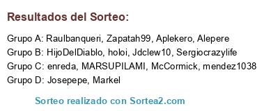Lista de participantes: Alepere, Zapatah99, MARSUPILAMI, HijoDelDiablo, Jdclew10, Raulbanqueri, Aplekero, Sergiocrazylife, Josepepe, enreda, holoi, mendez1038, McCormick, Markel.