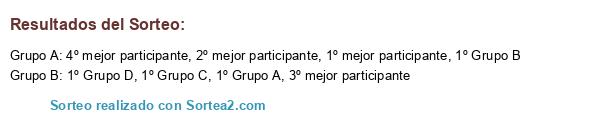 Lista de participantes: 1º Grupo A, 1º Grupo B, 1º Grupo C, 1º Grupo D, 1º mejor participante, 2º mejor participante, 3º mejor participante, 4º mejor participante.